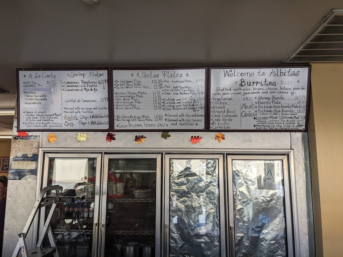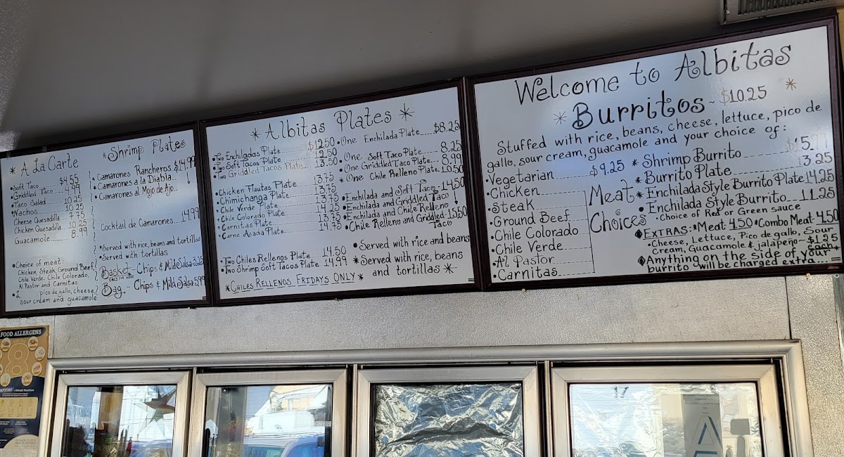 The menu offers a variety of traditional Mexican dishes organized into several categories to accommodate different preferences and meal sizes. The main section, Albitas Plates, features combination plates such as enchiladas, chimichangas, tacos, and chiles rellenos, providing hearty meal options typically priced around $14.99.